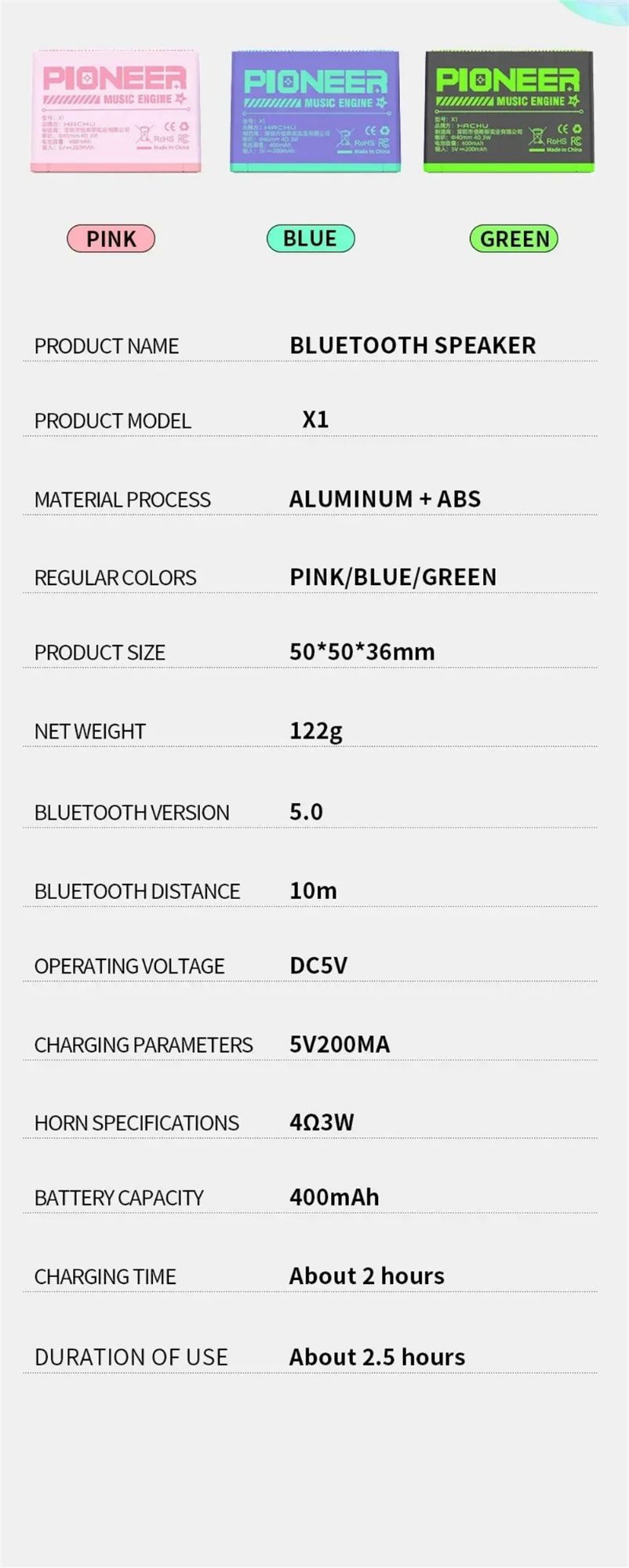 | Colors | Green, Blue, Pink |